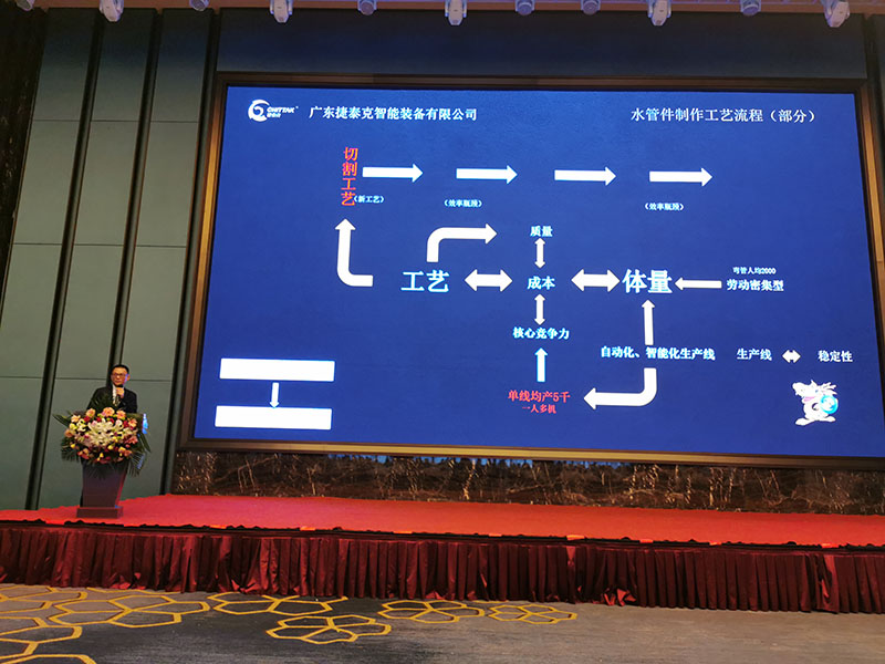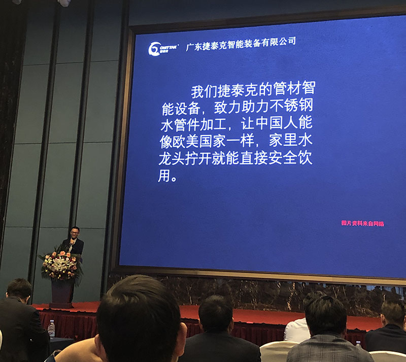 現場行業精英匯聚,共謀不銹鋼水管行業發展。會上我司黃董代表捷泰克上臺演講分享“捷泰克助力不銹鋼水管件加工智能化”,為不銹鋼水管件智能化、自動化生產提供解決方案。
