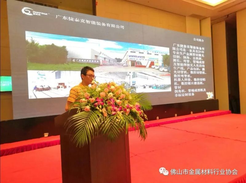 協辦單位、佛山市金屬材料行業協會常務理事單位--廣東捷泰克智能裝備有限公司董事長黃建濱發表了參會感想,介紹了捷泰克自2018年12月8日首次參加佛山市金屬材料行業協會召開的2018不銹鋼產業發展大會及后續系列會議的顯著效果,以及捷泰克致力于智能化高端激光切管機的研發定位與服務創新。